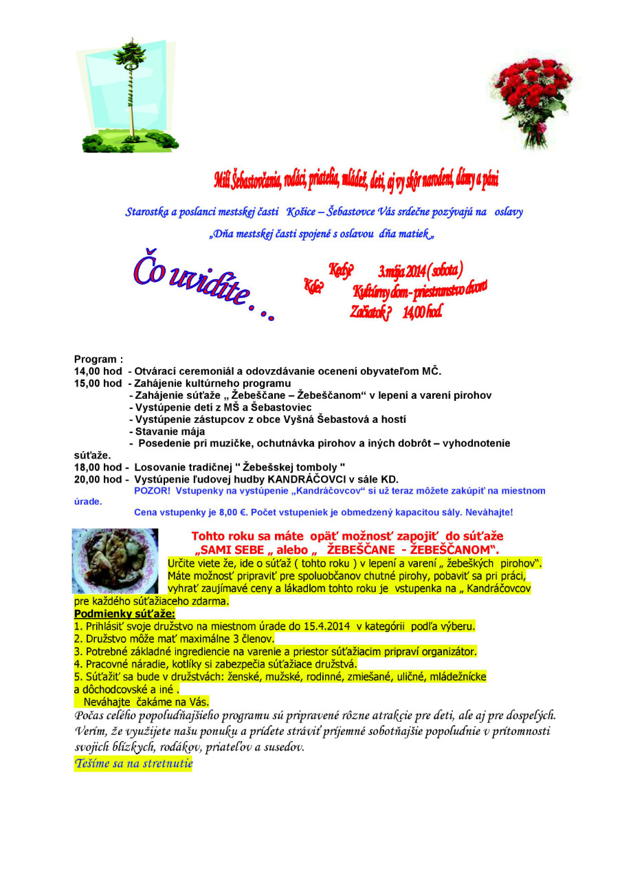 Vystúpime na Dni obce Šebastovce. Okrem spevu budeme variť pirohy. Veríme,že všetkým budú chutiť a zabavia sa pri našich pesničkách. Súčasťou osláv je aj stavanie mája, kde budeme tiež spievať.